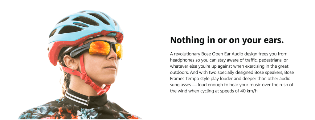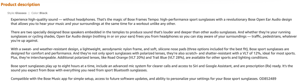 Created “From the Manufacturer,” bullets, and product description sections for Bose Frames Tempo, Bose Frames Tenor, and Bose Frames Soprano. Below is Bose Frames Tempo as an example.