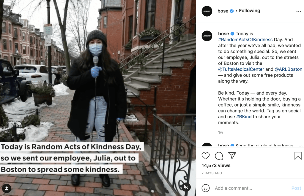After the year we’ve all had, Bose wanted to do something a little extra special for Random Acts of Kindness Day. So, they sent me into Boston to hand out free gifts to strangers, the Tufts COVID Clinic, and the Animal Rescue League of Boston. We planned, executed, and edited this video that was posted across all our social channels.
